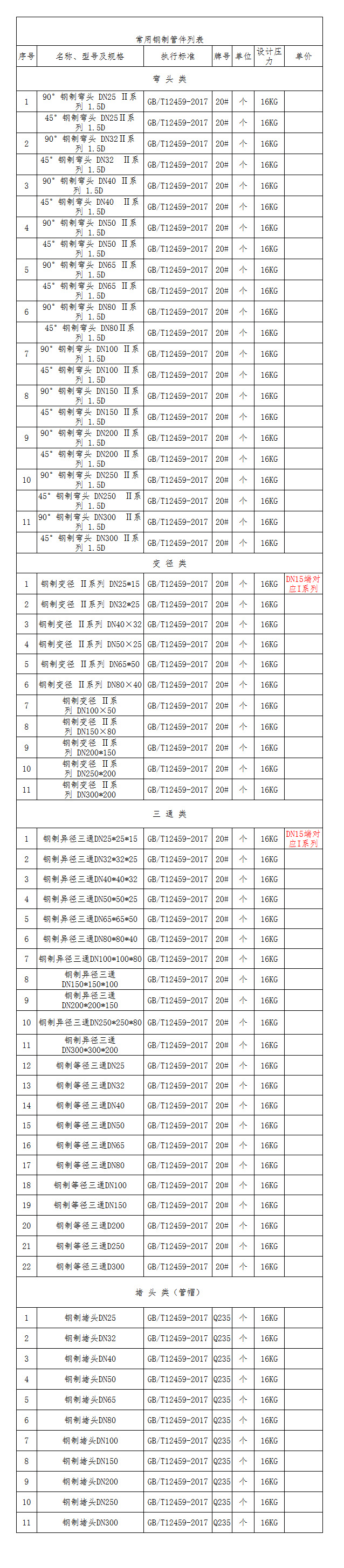 7)钢制变径和钢制三通类管件价格按照直通路大口径执行统一价格; 8)管件要做防锈处理,管件应作永久性标志。如果使用钢印标志,应注意钢印不要过深或太尖而造成裂纹或使管件壁厚减少到小于允许的最小壁厚,含13%税,到货价。 |